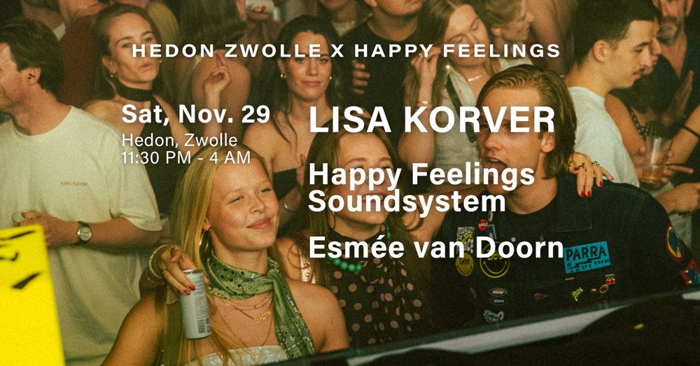 Maak je klaar voor Happy Feelings. Op zaterdag 29 november neemt Happy Feelings Hedon over voor een nacht vol euforie en oneindige energie. Verwacht de beste muziek, een dansvloer vol glimlachen, en de mooiste mensen die allemaal komen voor hetzelfde: een avond waar je het nog lang over zal hebben. Of je nu al vaker bent geweest of voor het eerst komt kijken: dit is er eentje om bij te zijn.
